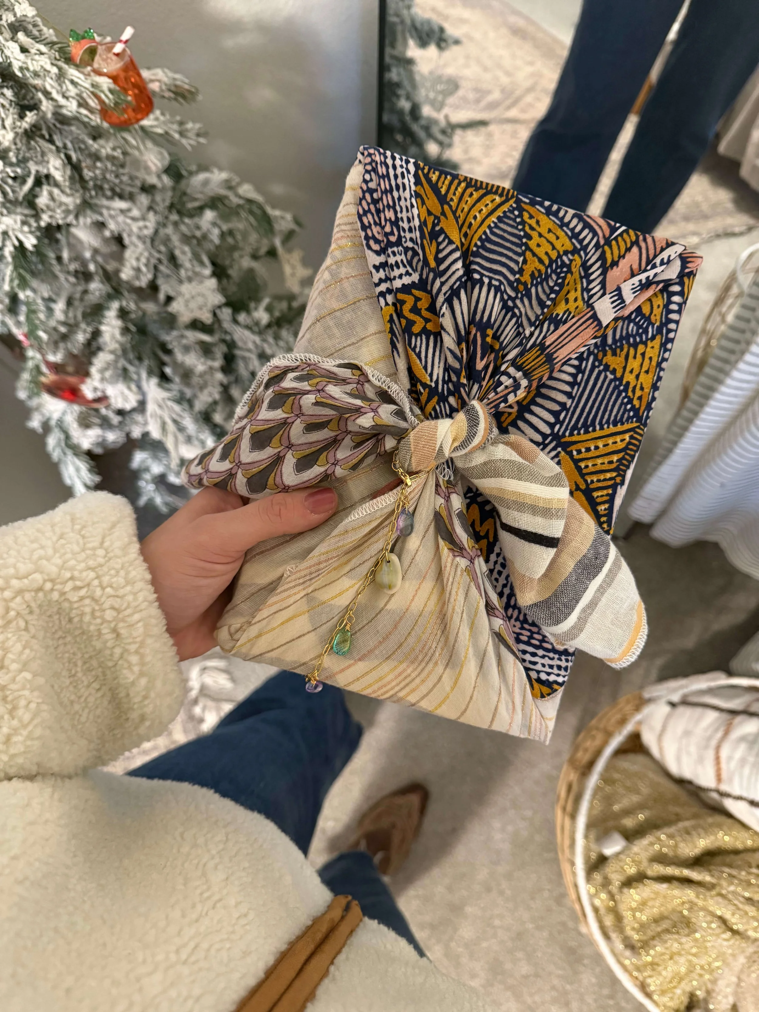 Fabric wrapping is one of my favorite plastic-free holiday swaps — you can find easy Furoshiki fabric gift wrapping techniques here.Tea towels, scarves, swaddles, or purpose-made cloth wraps become part of the gift itself. Little hands can help choose fabrics or tie simple knots, and the wrap gets reused year after year.